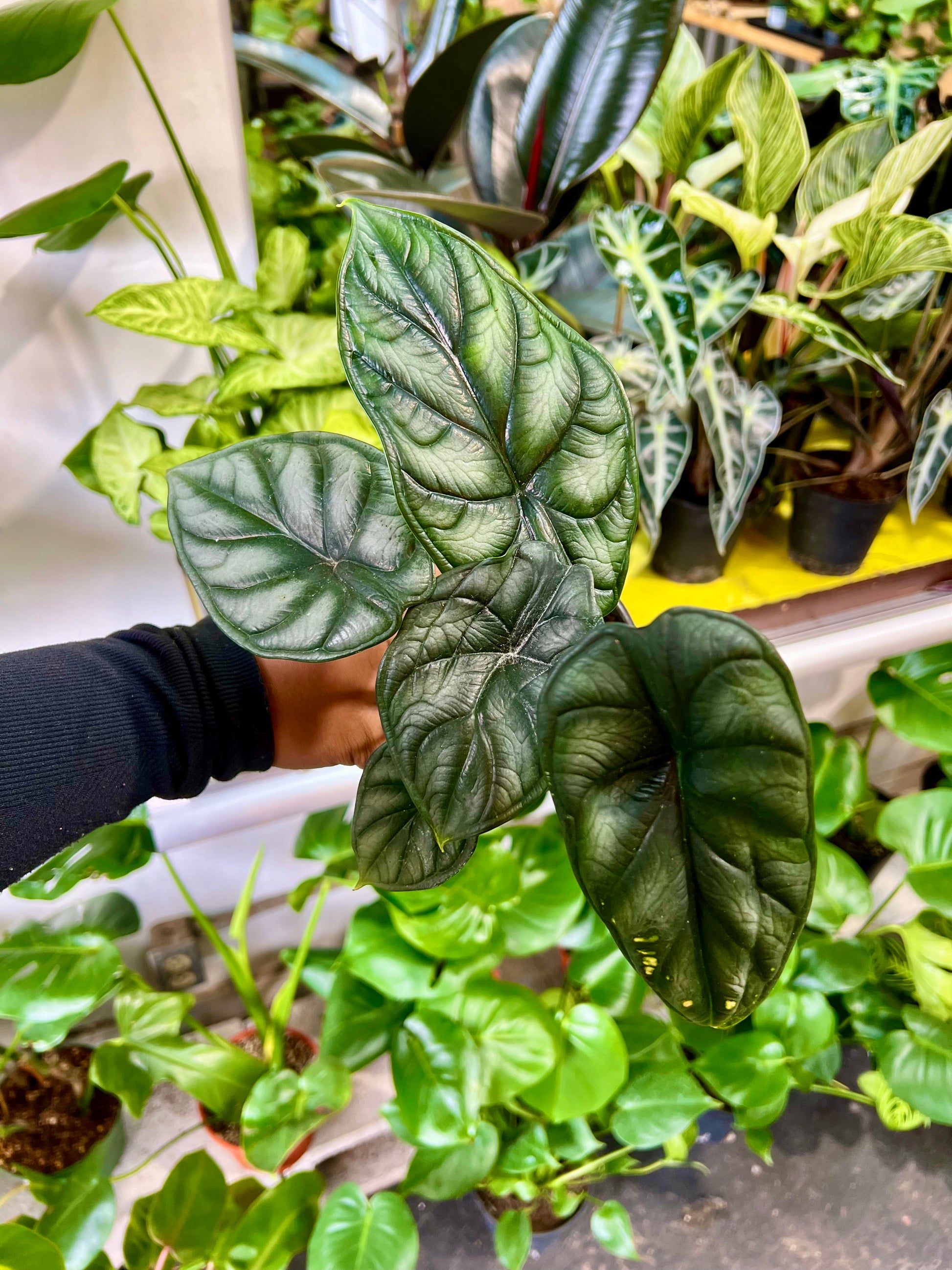Alocasia ‘Dragon Scale’ is a true showstopper. Its deep green, textured leaves have a striking, almost sculptural appearance that instantly draws the eye. Native to the tropical rainforests of Borneo, this rare variety is a favorite among collectors for its dramatic foliage and compact growth habit, making it perfect for adding a bold focal point to your indoor plant collection.