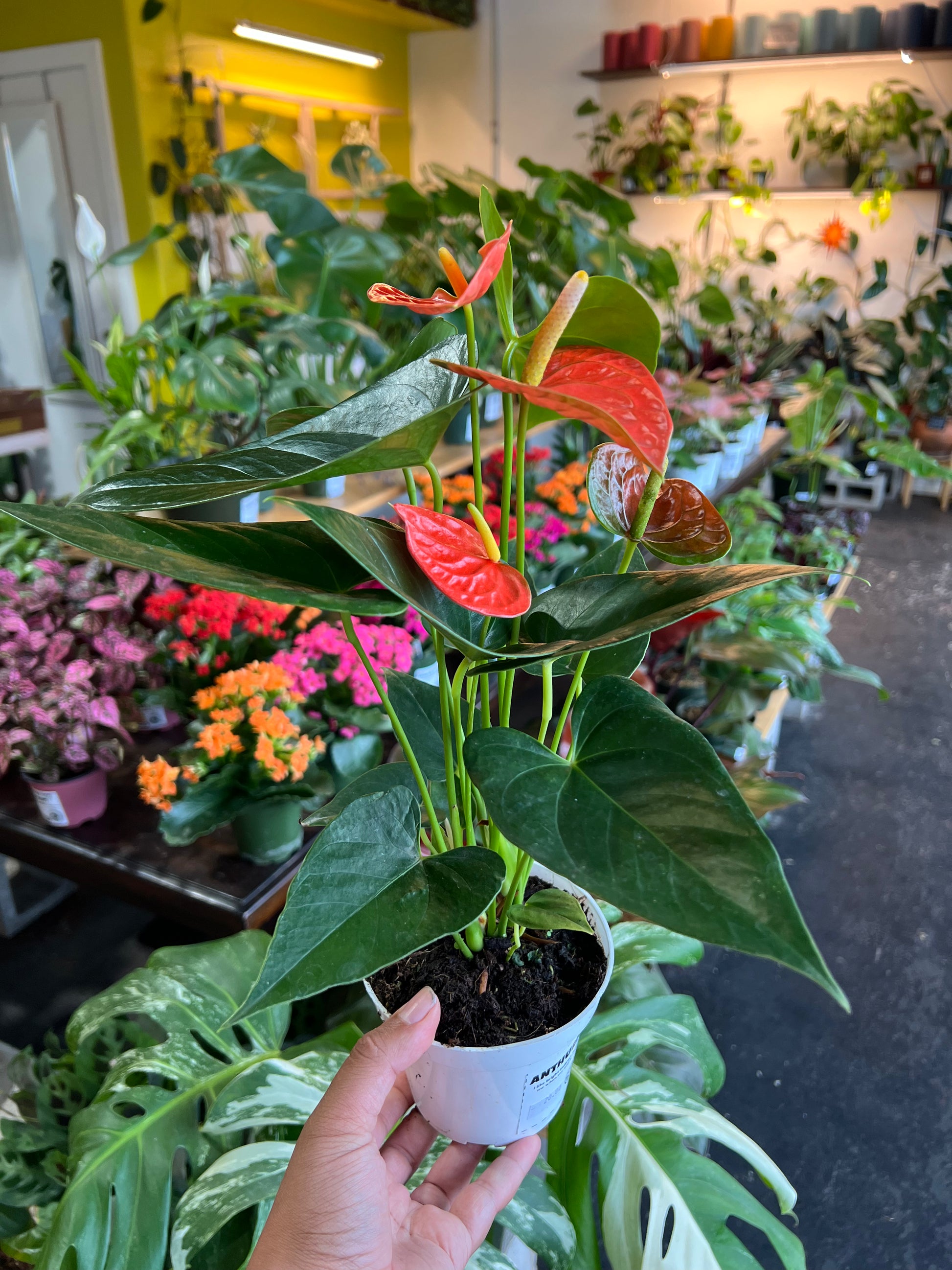 Description: These exotic houseplants have glossy heart-shaped leaves with a beautiful bloom that comes in a large array of colors. They can bloom all year long with enough light and water. The Anthurium originated in the South American rain forest so they thrive in high-humidity environments with a decent amount of shade.