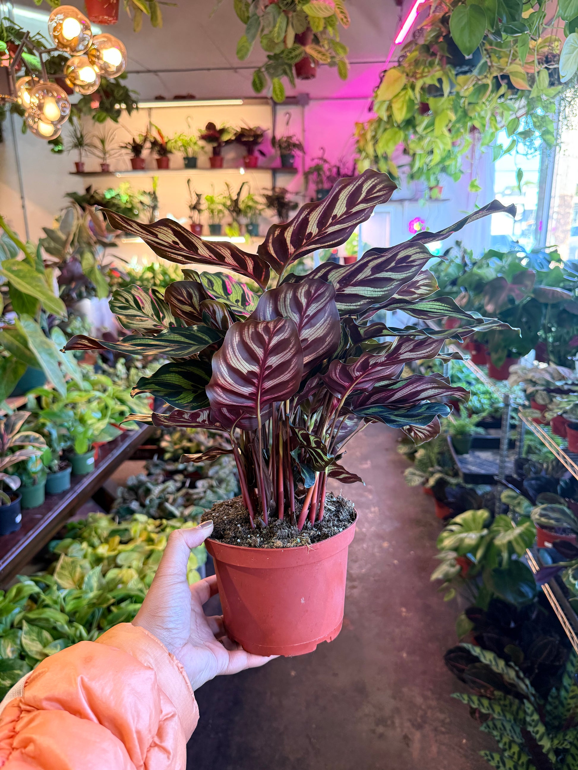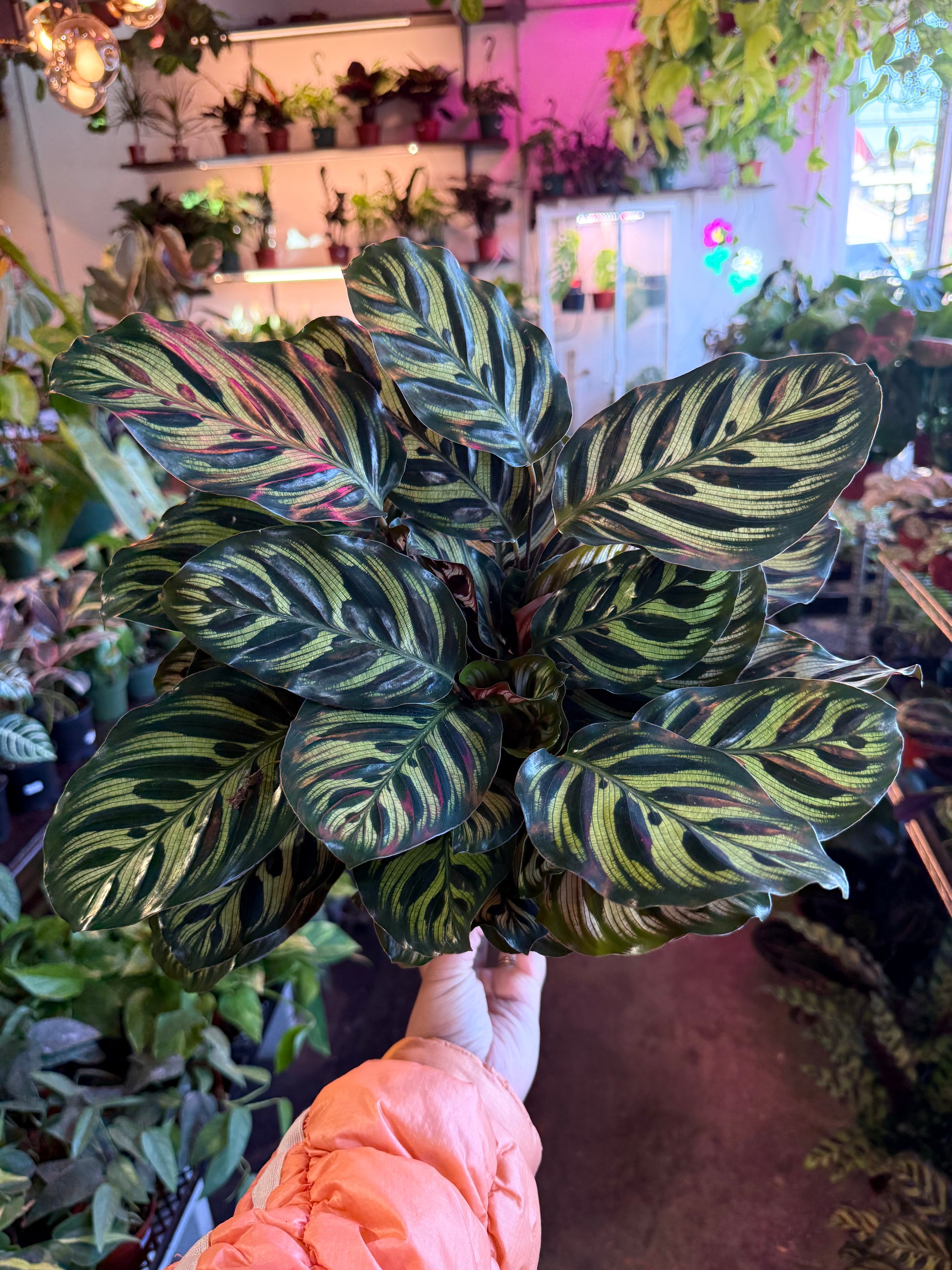 Description: This Calathea Makoyana comes with soft green leaves with uniquely shaped shades. Like all calathea plants, the leaves adjust as the sun rotates throughout the day. Calathea Plants, native to tropical South and Central America, Africa, and the West Indies, are grown primarily for their beautiful, brightly colored, upright, oval leaves.