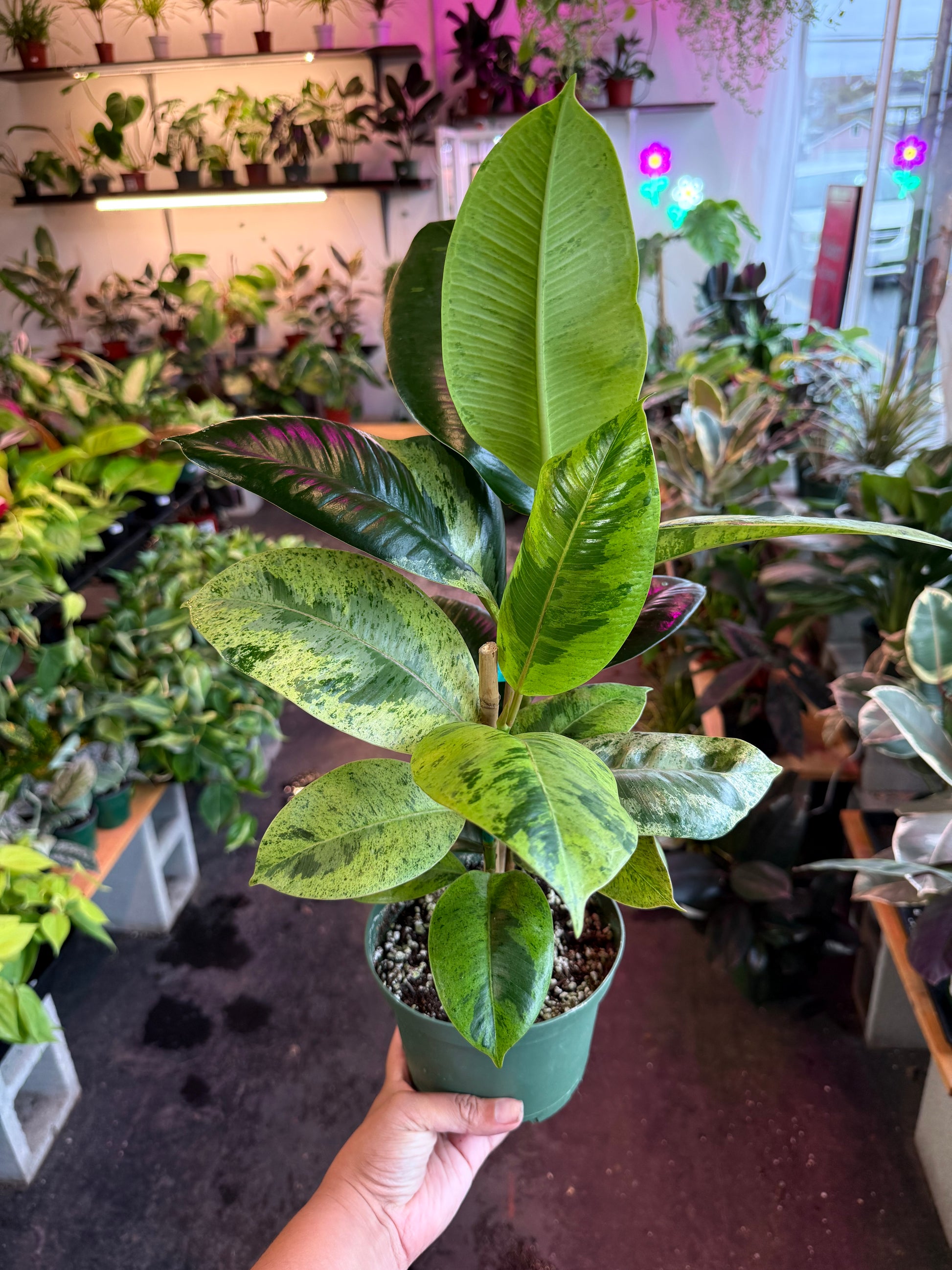 Description: Ficus shivereana 'Moonshine' is an uncommon Ficus species with 'mint' or mottled variegation. While similar to Ficus altissima, Ficus shivereana 'Moonshine' has different variegation. Ficus care is relatively simple. Most Ficus plants prefer bright indirect light. Make sure your plant is in a well-draining soil rich in organic matter and allow it to dry out almost completely between watering.