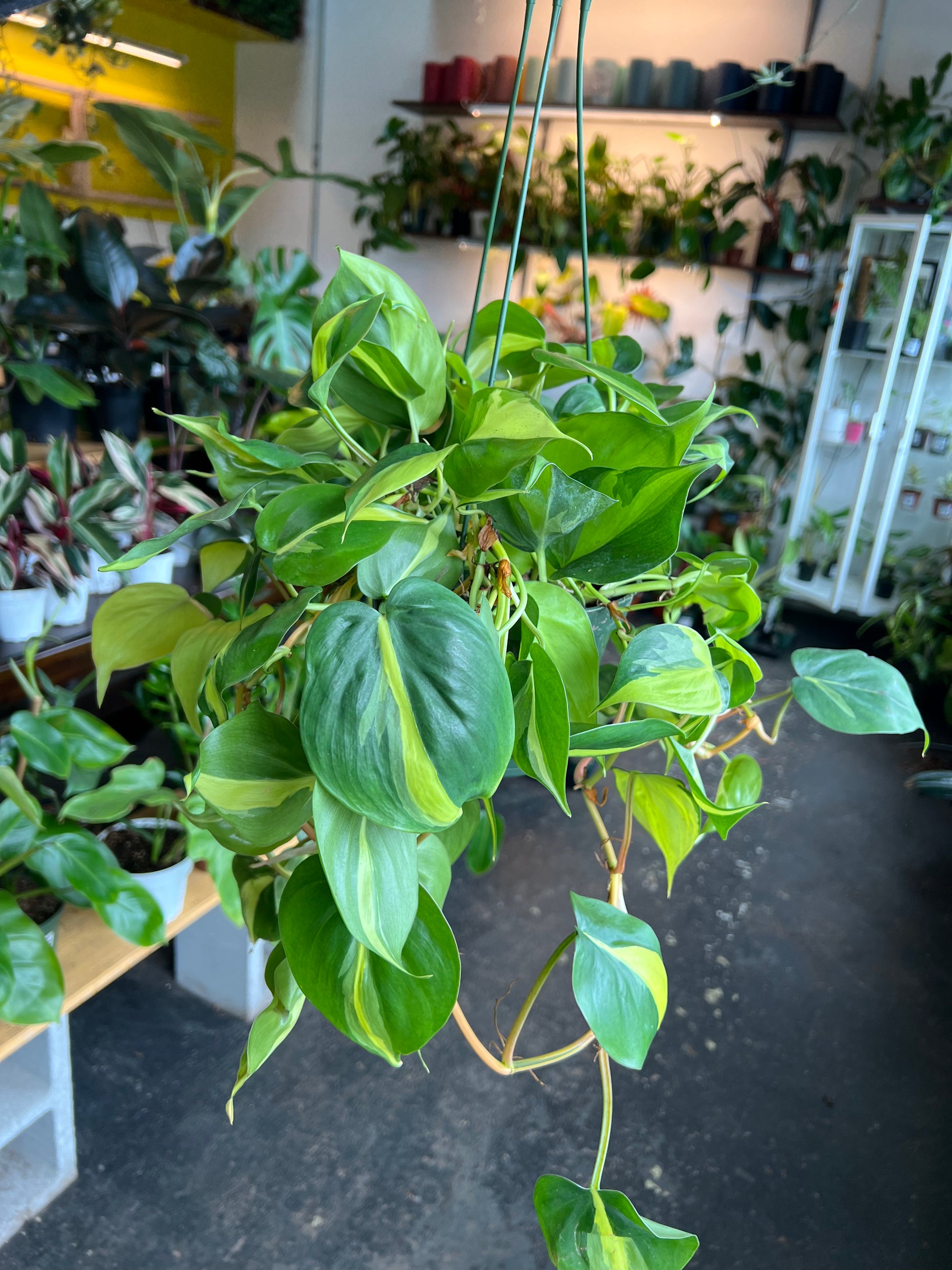 Description: This common epyphytic houseplant is native to coastal Brazil and grows in a vine-like or climbing fashion. It wields heart-shaped leaves and is a great addition to any office or household as it is very easy to care for, requiring minimal waterings and only needing low to medium indirect sunlight. This particular, "Brasil" variety, will have segment on each leaf separating its yellow and green color.